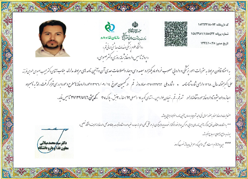 داروخانه دکتر صبوحی مجوز فروش اینترنتی اقلام غیر دارویی داروخانه را از دانشگاه علوم پزشکی قم ( معاونت غذا و دارو ) در سال ١٣٩٧ دریافت نموده است.