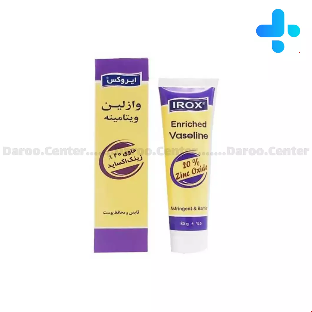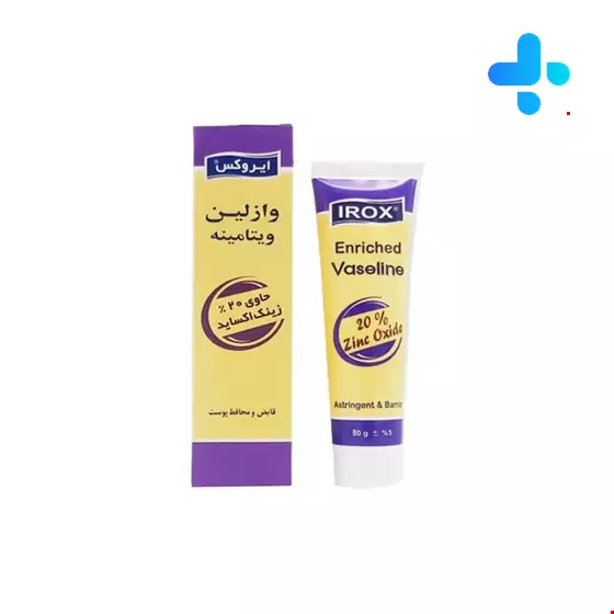 کرم وازلین ویتامینه ایروکس حاوی ۲۰٪ زینک اکساید،روغن جوانه گندم،اوره و اوسرین بوده و با تامین رطوبت مورد نیاز پوست از خشکی و خارش جلوگیری می نماید. کرم وازلین ویتامینه ایروکس جهت درمان انواع درماتیت، درماتیت آتوپیک و اگزما، پیشگیری و درمان ادرار سوختگی نوزادان و رفع التهاب، خشکی و خارش پوست کودکان و بزرگسالان بسیار موثر می باشد.